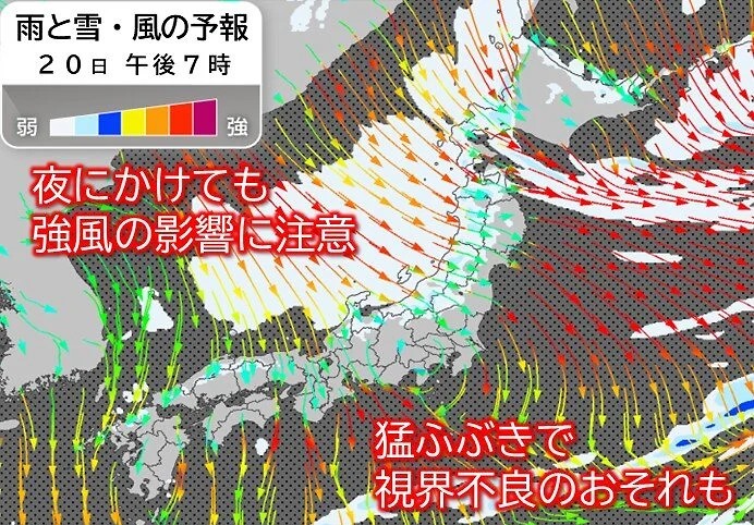 本日20日(火)は、全国的に風が強く、日本海側を中心にふぶきとなっている地域があります。